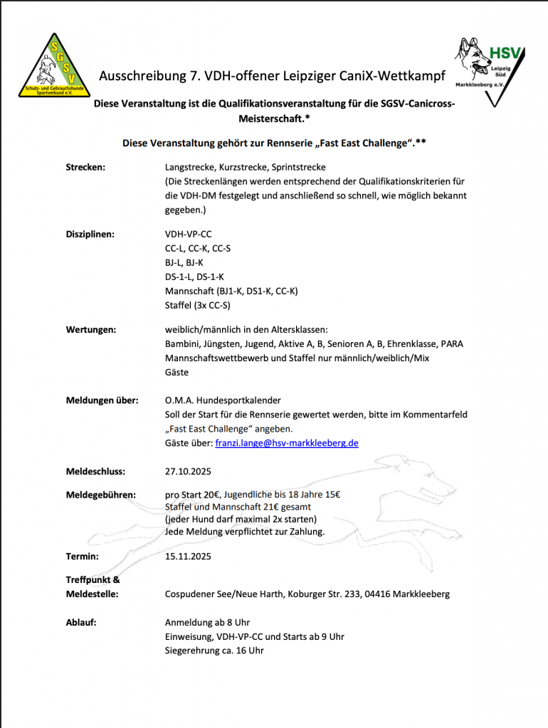 * Für eine Teilnahme an der SGSV-Canicross-Meisterschaft im März 2026 ist eine Teilnahme am 7. Leipziger CaniX-Wettkampf zwingend erforderlich. Zusätzlich ist eine weitere Teilnahme in der jeweiligen Disziplin an einer termingeschützten Veranstaltung des dhv notwendig, um die erforderlichen Qualifikationen für die SGSV-Canicross-Meisterschaft zu erbringen. Der Qualifikationszeitraum läuft vom 01.10.2025 bis 01.03.2026.